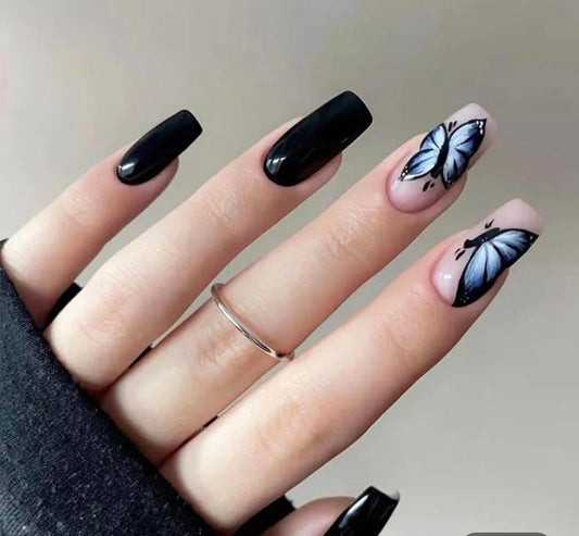Black & Pearl White with Blue Butterflies - Squoval #W092