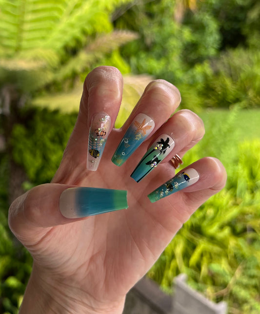 Emerald Green & Pale Pink with Leaves - Squoval #W534
