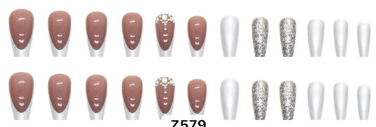 Pearl White, White Tips, Silver Glitter & Jewels - Coffin #Z579