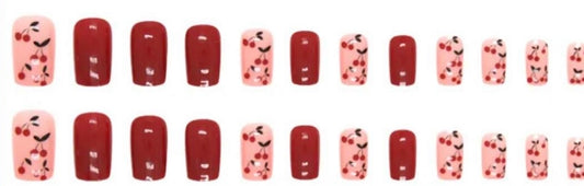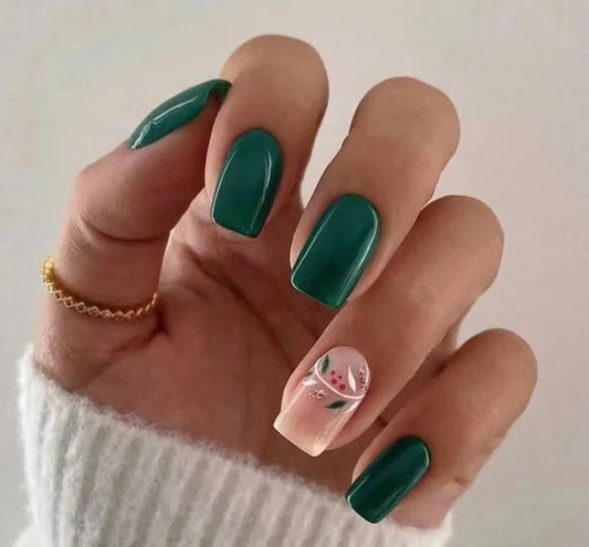 Emerald Green & Pale Pink with Leaves - Squoval #W534