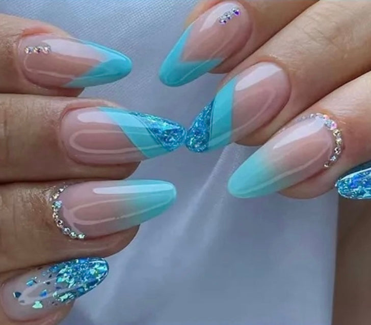 Turquoise Tips with Turquoise Glitter & Jewels - Almond #Z670